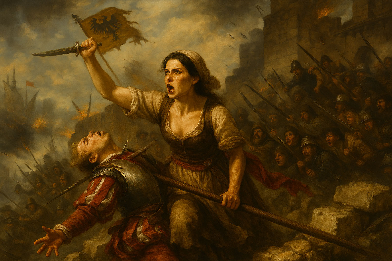 AI-generated image: A 16th-century Galician woman drives a pike into an English officer during the siege of La Coruña, surrounded by smoke, fire, and defenders on the crumbling city walls.