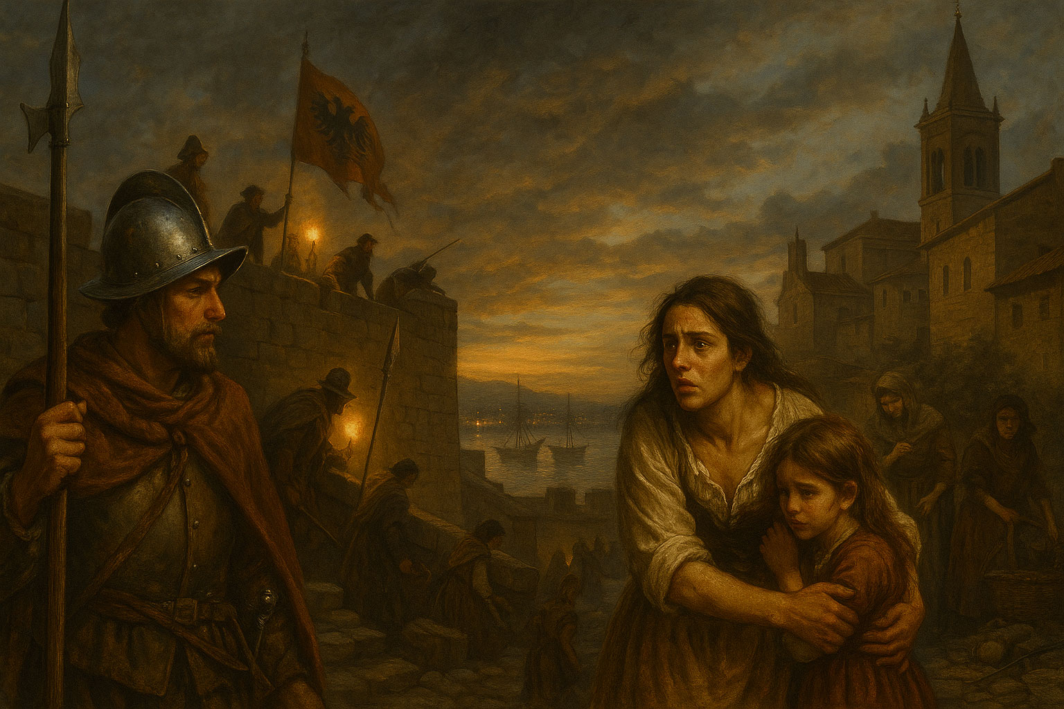 AI-generated image: Citizens of La Coruña prepare for the arrival of the English fleet in 1589, lighting torches along the city walls and gathering in fear and determination beneath a stormy sky.