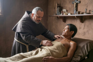 AI-generated representation of a Spanish friar treating an Indigenous patient in a modest room, inspired by the historical role of religious orders in evangelizing through healing. The presence of the crucifix, shelves, and subdued light evokes a moment of intimate spiritual care.