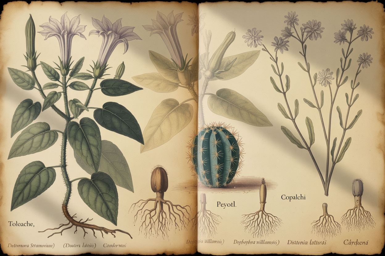 Artificially generated botanical illustration showing Toloache (Datura stramonium), Peyotl (Lophophora williamsii), and Copalchi (Hintonia latiflora), based on early modern herbal sources. The roots, leaves, and flowers are rendered in the style of 16th–17th century field herbals.