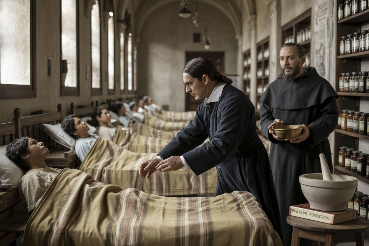 AI-generated image depicting a 17th-century hospital ward in New Spain. A creole physician examines a mestizo patient while a friar assists nearby. Rows of beds, labeled jars, and a book marked “Reglas del Protomedicato” evoke the institutional and moral landscape of early modern medicine.