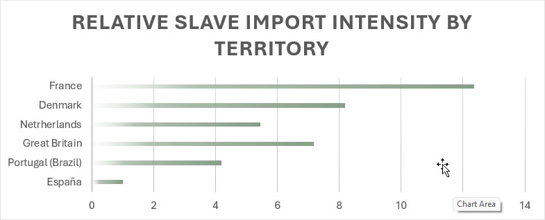 - Relative dimension — Spain controlled most of the continent’s landmass yet moved several-fold fewer captives per square kilometre and per inhabitant than the Portuguese, British or French empires. Slave density was highest where European planters staked everything on monoculture: Haiti, Barbados, Jamaica, Brazil.